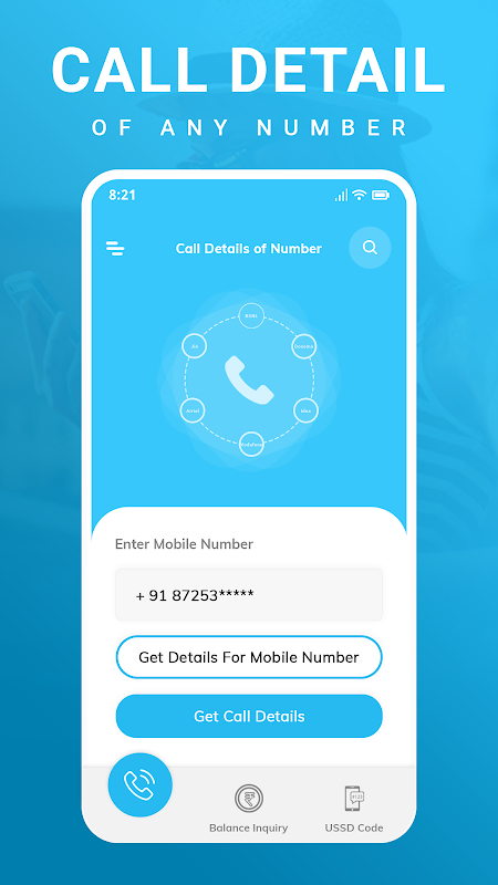How to Get Call Details : Call History is used to get call details of any number you want. It also shows Call History like missed calls, received calls and dialed calls. It helps the indian prepaid telecom users to find the numbers for specific operations like Recharge, Main, Message, Net Balance enquiry, Finding own number and Customer care number. It supports telecom operators like Airtel, Aircel, Idea, Vodafone, Uninor, Tata Docomo, BSNL and Reliance. you can find from which state/telecom operator a mobile number belongs to. This app can show your call log.