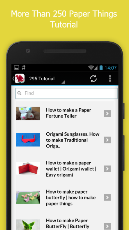 Ứng dụng này "Cách làm những thứ bằng giấy" nó là một ứng dụng cung cấp hơn 250 hướng dẫn để làm nhiều thứ bằng giấy khác nhau. Có các video hướng dẫn trang điểm dễ dàng cho đến nhiều thứ bằng giấy. Đây là một số ví dụ