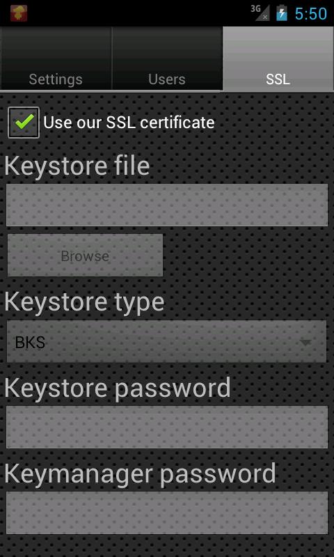 - If you enable SSL (FTPS): use our SSL certificate, use your own keystore, set keystore type (BKS or PKCS12), set keystore password, set keymanager password