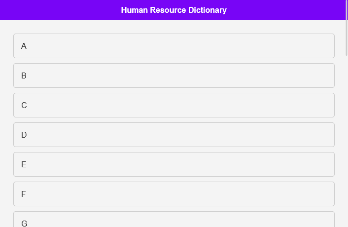 Chào mừng bạn đến với ứng dụng từ điển quản lý nguồn nhân lực, người bạn đồng hành không thể thiếu của bạn để nắm vững thuật ngữ HRM một cách dễ dàng. Được thiết kế dành cho các chuyên gia nhân sự, sinh viên và những người đam mê, ứng dụng của chúng tôi cung cấp nhiều tính năng để nâng cao hiểu biết và trình độ của bạn về các khái niệm HRM.