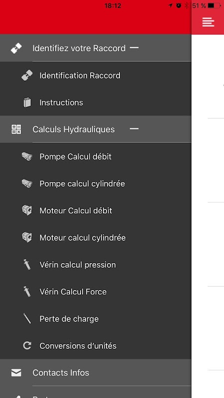 L'application permet aussi de calculer facilement tous les paramètres de pompes hydrauliques, moteurs hydrauliques, vérins hydrauliques, de pertes de charge hydrauliques.