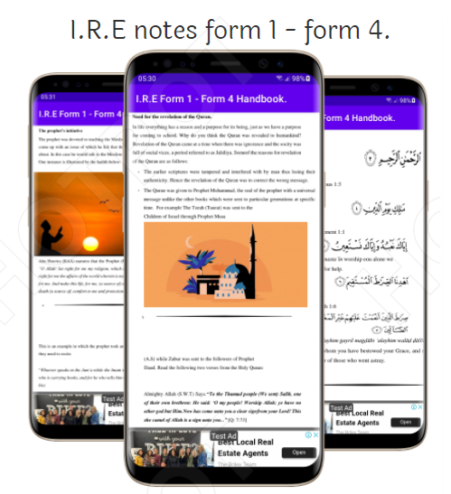Phần mềm di động ghi chú I.R.E: Handbook f1 - f4 chứa các ghi chú theo mẫu 1 - mẫu 4 của IRE KCSE. Chủ đề chính của ứng dụng này là để nâng cao kiến thức trong Giáo dục tôn giáo Hồi giáo. Ứng dụng này đảm bảo học sinh đã đạt được các kỹ năng và chuyên môn trong việc giải quyết các câu hỏi IRE nhiều hơn trong kỳ thi cuối kỳ KCSE. Ứng dụng này có các chủ đề sau: