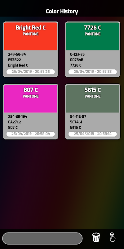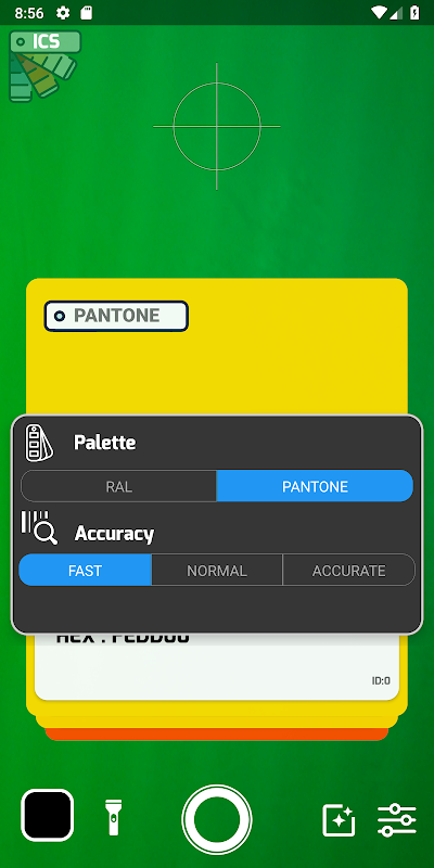 how many times did you get a color from shop and you realize it does not match the one already used ?? ICScanner scans the color and finds the corresponding of the standard palette "RAL" or "PANTONE". provides you with the color code based on the selected palette and the respective RGB and HEX values. when making a scan, you can select the palette to use, and the accuracy of the scan. a low accuracy finds in the color palette the one closest to the scan. High accuracy returns the exact color if it is present in the palette. When a scan is performed, the value found is saved in the history and can be consulted at any time to retrieve the values of a past scan.