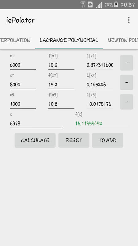 Chương trình cho phép bạn để tính toán nội suy, ngoại suy và nội suy kép. Theo phương pháp nội suy tuyến tính, Newton và Lagrange đa thức