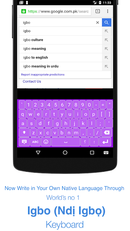 Igbo Keyboard allows you to type your messages, update your status on social networks or compose emails in your own native Igbo language on your Android phone.