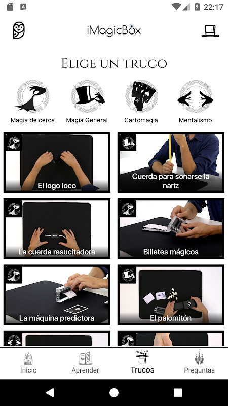 La sección de “Trucos” se utiliza principalmente con los elementos que vienen en la caja de iMagicBox. Ahí verás más de 50 vídeos donde podrás aprender esos trucos con los que sorprender a tu familia y amigos con mucha magia.