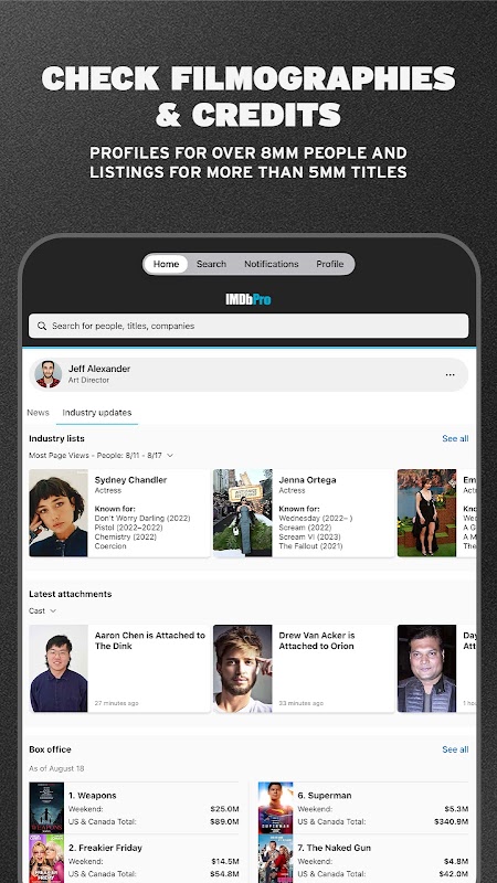 IMDbPro cung cấp những thông tin chuyên sâu độc quyền về ngành, bao gồm bảng xếp hạng STARmeter, dữ liệu nhân khẩu học về tài năng và các công cụ theo dõi dự án được các công ty giải trí và hãng phim hàng đầu sử dụng. Thông báo theo thời gian thực đảm bảo bạn không bao giờ bỏ lỡ cơ hội, cập nhật thông tin về các sản phẩm mới, thông báo tuyển diễn viên và tin tức trong ngành liên quan đến sự nghiệp của bạn. Hãy tham gia mạng lưới chuyên nghiệp được các nhà hoạch định chính sách trong ngành giải trí trên toàn thế giới tin tưởng. IMDbPro là một lựa chọn thay thế tuyệt vời cho rentrak, comscore, backstage và studio system (studiosystem).