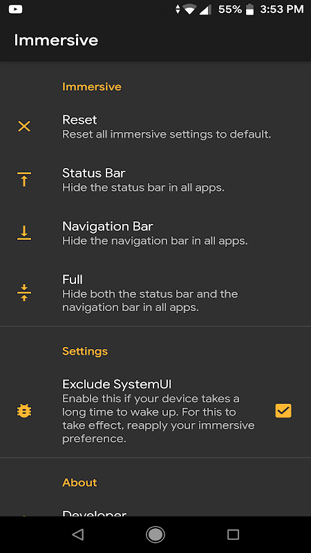Ứng dụng có thể xử lý 2 loại ngâm (chúng không hoạt động cùng lúc). Có nhúng thanh trạng thái, sẽ ẩn thanh trạng thái và có chìm điều hướng, sẽ ẩn thanh điều hướng. Có một nút đặt lại để tắt hoàn toàn tính năng ngâm.