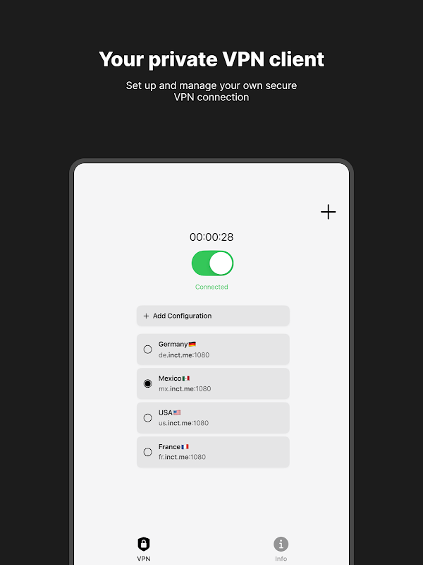 InConnect Client là một công cụ mạng nhẹ và linh hoạt được thiết kế cho những người dùng muốn quản lý các kết nối proxy của riêng họ bằng giao thức VLESS. Cho dù bạn đang thiết lập máy chủ cá nhân hay thử nghiệm các cấu hình riêng tư, InConnect đều cung cấp cho bạn toàn quyền kiểm soát cách thức và thời điểm kết nối.