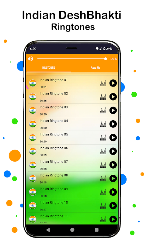 Nhạc chuông Ấn Độ Bài hát DeshBhakti là bộ sưu tập giai điệu đơn giản nhất. bạn có thể tải nó xuống cho điện thoại di động của mình hoặc cài đặt cho chúng tôi nhạc chuông Ấn Độ của bạn. Ứng dụng Nhạc Chuông Yêu Nước Ấn Độ mới được cập nhật với chất lượng hàng đầu chắc chắn sẽ khiến bạn hài lòng. Đặc biệt, ứng dụng này hoàn toàn miễn phí.