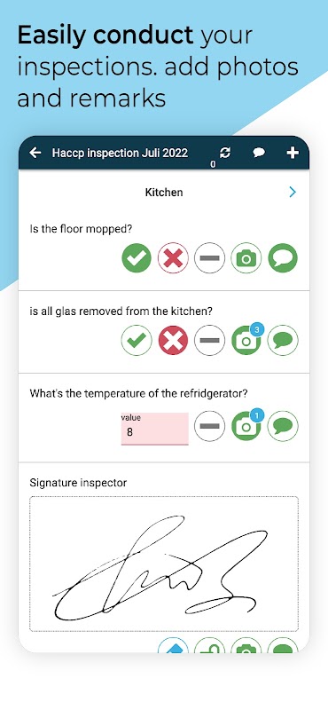 Quản lý các báo cáo và kết quả kiểm tra tiêu cực cũng như chỉ huy vòng tròn PDCA. Từ An toàn thực phẩm/HACCP đến ISO 9001, từ OSHAS đến An toàn phòng cháy chữa cháy và danh sách kiểm tra xây dựng. Nhờ sao lưu đám mây hoàn chỉnh và an toàn, bạn và đồng nghiệp của mình luôn có thể xem báo cáo từ bất kỳ vị trí nào và cung cấp cho họ thông tin theo dõi mong muốn.