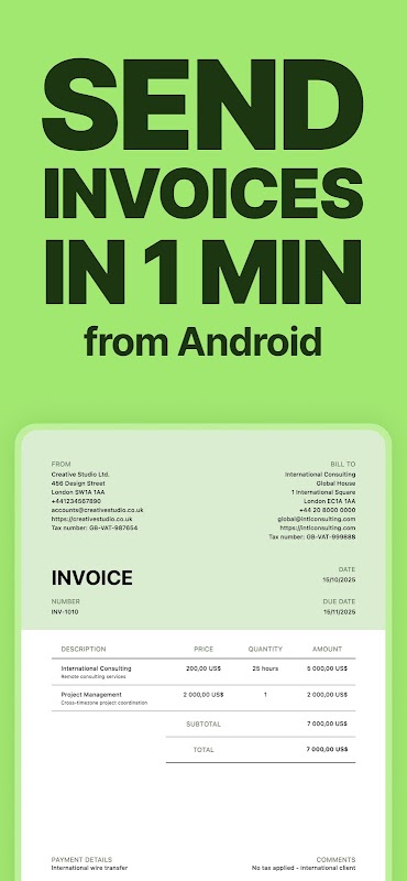 Invoice.app là giải pháp lập hóa đơn mạnh mẽ nhưng đơn giản được thiết kế với mục tiêu dễ sử dụng. Được thiết kế riêng cho người làm việc tự do, nhà thầu và chủ doanh nghiệp nhỏ, đây là công cụ lý tưởng để quản lý tài chính hiệu quả. Có sẵn trên Android, iOS, iPadOS và macOS với khả năng đồng bộ hóa liền mạch trên nhiều thiết bị, Invoice.app sẵn sàng hỗ trợ doanh nghiệp của bạn, bất kể bạn ở đâu.