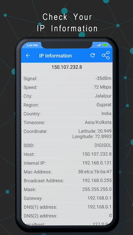 IP Information – It shows Wifi or Internet IP Informations like Signal, Speed, Location, SSID, Internal IP Mac Address, Frequency, connection type and many more.