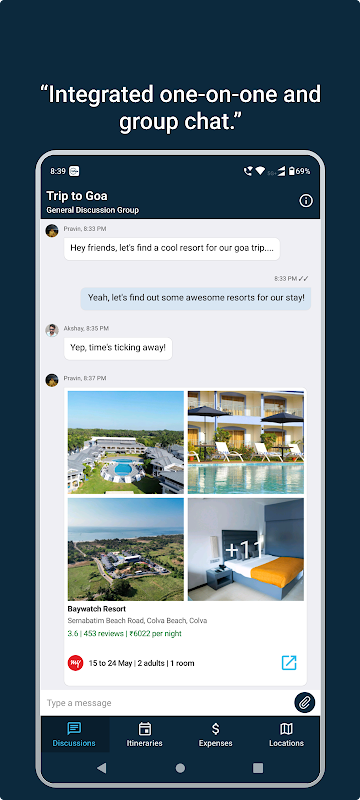 Giao tiếp dễ dàng với nhóm thông qua tính năng trò chuyện nhóm tích hợp trong ứng dụng, tạo điều kiện thuận lợi cho việc phối hợp và cộng tác trong suốt chuyến đi.