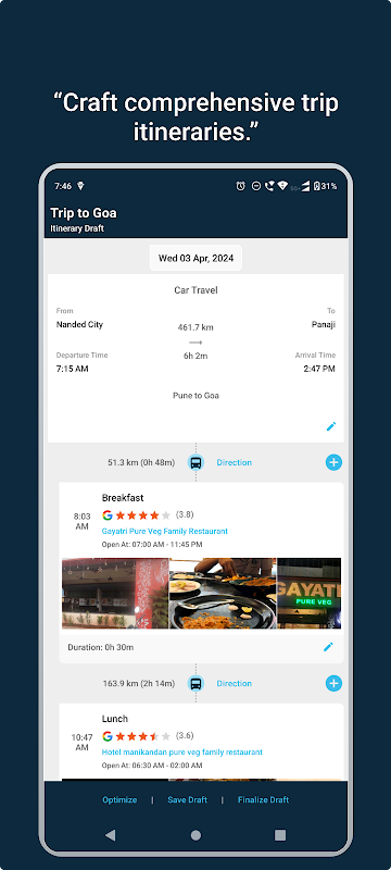 Trực quan hóa ngay lập tức kế hoạch chuyến đi của bạn trên giao diện dựa trên Google Maps, loại bỏ nhu cầu sử dụng nhiều ứng dụng và trang web. Kết nối liền mạch các điểm đến của bạn bằng các đường trên bản đồ, cung cấp cái nhìn tổng quan rõ ràng về tuyến đường của bạn, hoàn hảo cho các chuyến đi đường!