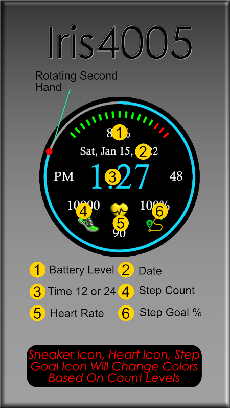 Iris4005 is a digital watch that is and simple and functional with plenty of colorful options. The watch face displays day, date, and month. The time is displayed in either 12 hour or 24 hour format and is automatically set by your smartphone time format setting. Battery percentage, heart rate, step count and step goal percentage are displayed. There are 5 Theme colors that change the index display and the time font colors. Icons for the Steps, Step Goal and Heart Rate will change colors based on the value of each function. The seconds are also displayed in a rotating ring that also will change with the theme color. The AOD is simple with just the time and date. Most languages are supported. See feature guide for details.