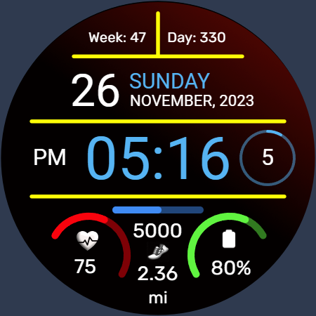 Iris502 là đồng hồ kỹ thuật số đơn giản và tiện dụng với nhiều tùy chọn đầy màu sắc. Mặt đồng hồ hiển thị thứ, ngày, tháng, năm. Thời gian được hiển thị ở định dạng 12 giờ hoặc 24 giờ và được tự động đặt theo cài đặt định dạng thời gian trên điện thoại thông minh của bạn. Phần trăm pin, nhịp tim và số bước được hiển thị. Khoảng cách được hiển thị bằng dặm hoặc km dựa trên nước xuất xứ. Có 7 tùy chọn màu sắc tùy chỉnh để lựa chọn. Hầu hết các ngôn ngữ đều được hỗ trợ. Xem hướng dẫn tính năng để biết chi tiết.