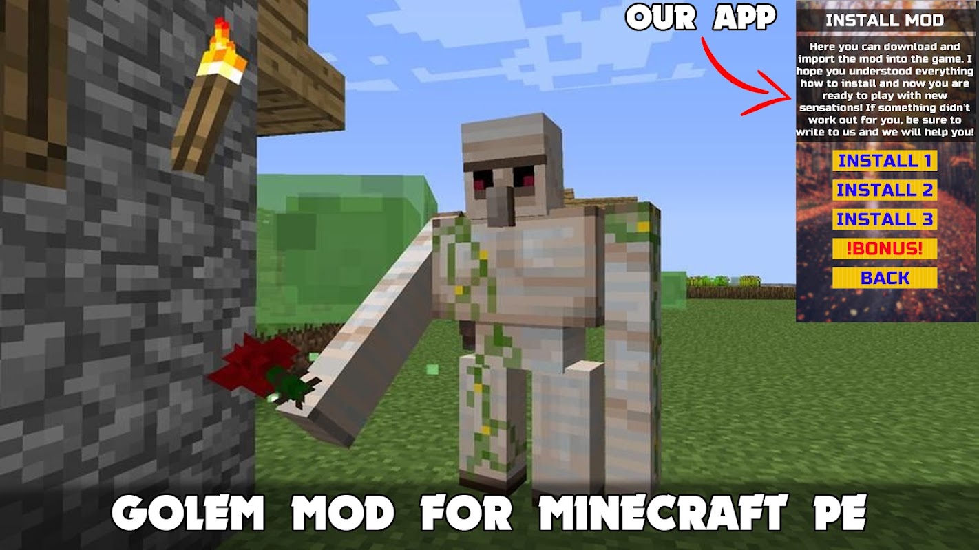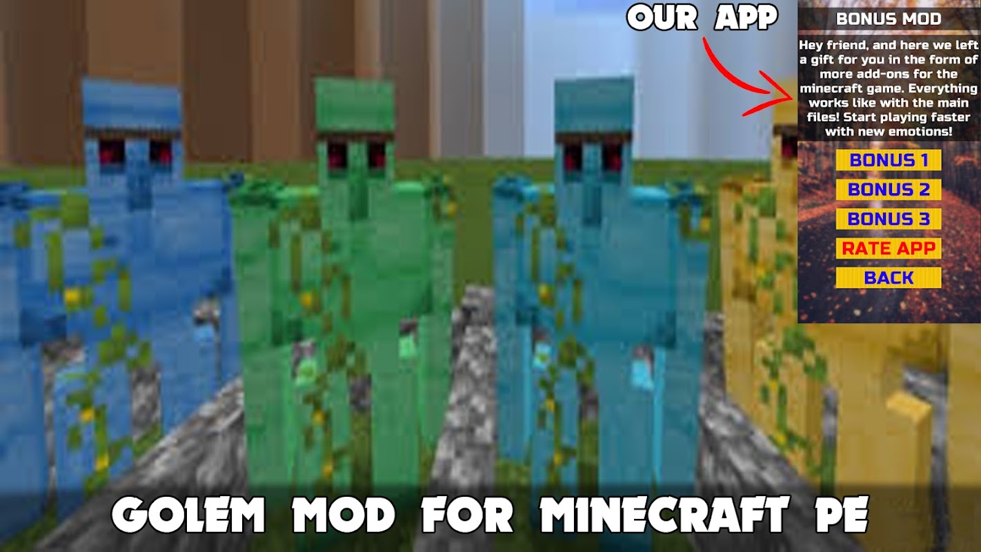 😀🤣Nếu bạn cảm thấy mệt mỏi với phiên bản Minecraft thông thường và muốn đa dạng hóa lối chơi, bạn có thể cài đặt một trong những sửa đổi của chúng tôi. Đây là những gì chúng ta đã nói ở trên. Nhưng đây sẽ không phải là một phần bổ sung thông thường có thêm những con vật tuyệt vời, địa điểm hoặc đạo cụ mới, mà là một bản mod độc đáo. Bạn có thể tải xuống Golem Mod luôn được cập nhật cho Minecraft Pocket Edition 2022!🤣😀