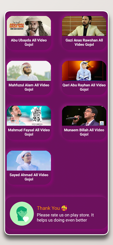 Nhận tất cả Gojol Hồi giáo phổ biến và mới của các nghệ sĩ Hồi giáo nổi tiếng bao gồm Munaem Billah, Gazi Anas Rowshan, Aqsa Shabaab, Mahmud Faysal và nhiều ca sĩ khác trong ứng dụng Muslim Gojol.