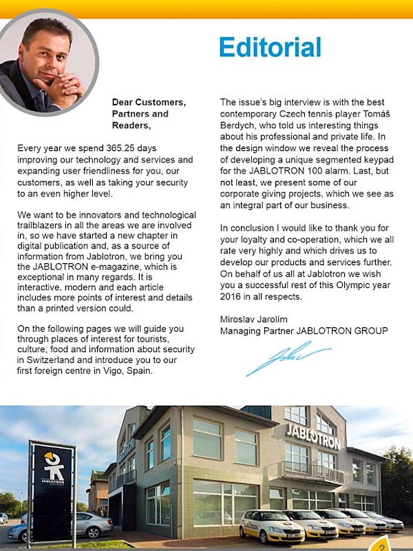 Digital magazine by JABLOTRON ALARMS is now ready to be explored on your tablet and smartphone. Our interactive magazine brings you all the useful information regarding security, our projects and innovations and offers reading for you free time. We let you to have an insight to our production process and learn more about security news. Reading for your free time offers interesting interviews with famous people, articles about attractive places to visit and let you to get to know culture habits of foreign countries.