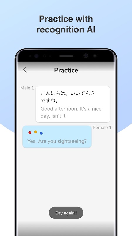Hỗ trợ học giao tiếp tiếng Nhật trực quan thông qua các bài hội thoại, hiệu quả với các bài học, và tính năng kiểm tra hội thoại thông minh và dễ sử dụng.