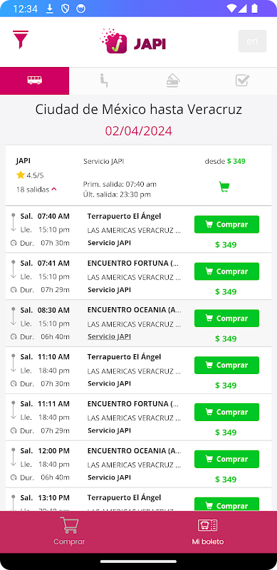 Với Japi, việc đi đến những điểm đến nổi tiếng nhất là Xalapa, Veracruz và Thành phố Mexico chưa bao giờ dễ dàng hơn thế. Ứng dụng của chúng tôi cho phép bạn khám phá nhiều lựa chọn du lịch, chọn chỗ ngồi ưa thích và đặt vé trong vài phút, tất cả đều thuận tiện từ thiết bị di động của bạn.