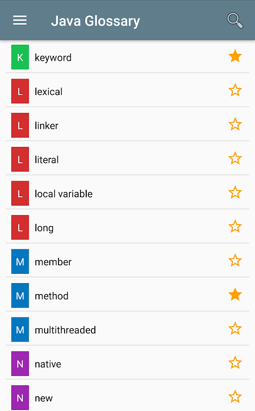 Don't miss handy glossary of Java and Android terms. The app contains more than 250 special term and their definitions. You can save the most necessary terms in Bookmarks.
