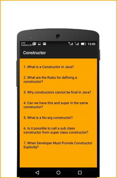 Ứng dụng này chứa bộ sưu tập các câu hỏi và câu trả lời phỏng vấn java cốt lõi quan trọng nhất trong mỗi chủ đề của java lõi cùng với câu trả lời của họ.