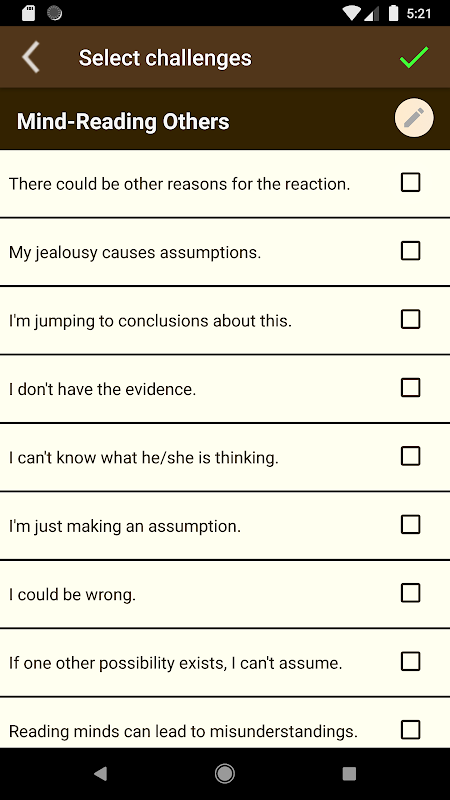 • Hoàn toàn có thể tùy chỉnh: thay đổi các thuật ngữ CBT (niềm tin và định nghĩa) được sử dụng trong nhật ký để phù hợp với hệ thống bạn quen thuộc, thêm các tuyên bố thách thức của riêng bạn cho mỗi niềm tin, thêm tâm trạng / cảm xúc, thêm các hoạt động lành mạnh để theo dõi, thay đổi màu sắc của ứng dụng