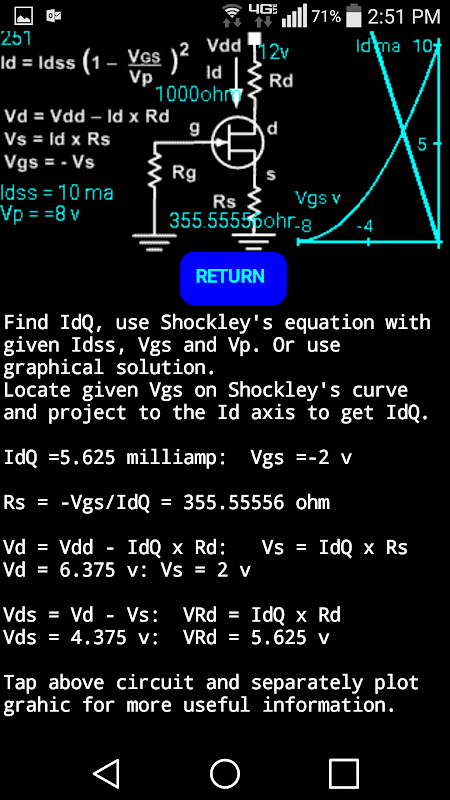 Ứng dụng này cung cấp 2 lựa chọn để giúp bạn giải quyết vấn đề JFET tự thiên vị. Tùy chọn 1 sẽ hướng dẫn bạn qua một giải pháp đồ họa để tìm các điểm hoạt động nếu tất cả các giá trị mạch được đưa ra.