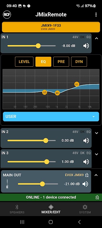 Ứng dụng RCF JMixRemote cung cấp khả năng điều khiển từ xa hoàn toàn các biến thể của bàn trộn âm thanh trong dòng EVOX J8 và J9, thông qua Bluetooth LE.