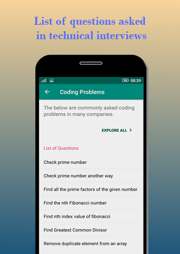 Ứng dụng này đã quản lý các mẫu mã trong 15 chủ đề bao gồm các cấu trúc dữ liệu trong JavaScript và sắp xếp và bao gồm hầu hết các tính năng ngôn ngữ và các câu hỏi mã hóa quan trọng được hỏi trong các công ty CNTT hàng đầu khác nhau.