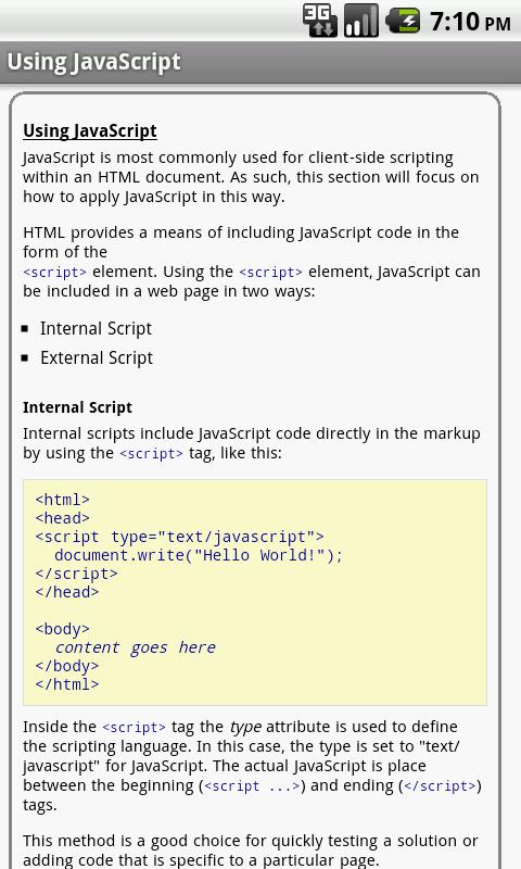 The JavaScript properties/functions/methods are categorized and searchable. Each detailed information screen contains a description, parameters, examples, browser compatibility, and more. In addition, most of the examples include the actual output.