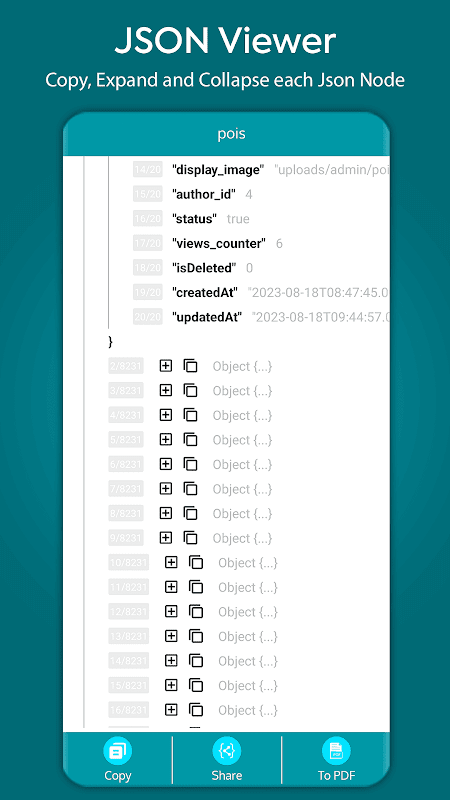 🔍 Bạn mệt mỏi với việc sàng lọc dữ liệu JSON phức tạp? Trình xem tệp JSON cho phép bạn xem các tệp json ở định dạng dễ đọc với con người bằng cách đánh dấu cú pháp. Bạn có thể mở rộng hoặc thu gọn các đối tượng json trong trình chỉnh sửa tệp json. Ngoài ra, bạn có thể chuyển đổi json sang pdf một cách nhanh chóng bằng trình đọc tệp JSON.
