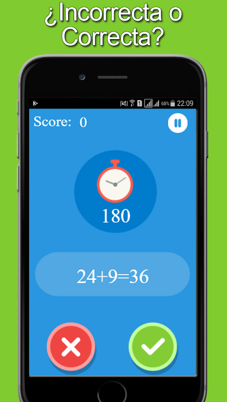 La aplicación consiste en que dada una operación deberás responder si esta "Correcta" o "Incorrecta" con un tiempo cada vez más limitado ¡Lograr tu mejor puntuación!