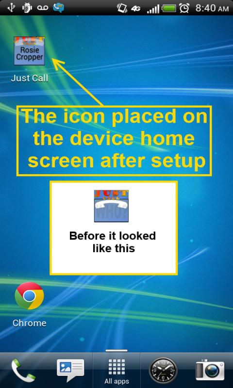 Set once and call your favorite person in the whole wide world with just one touch. Launch Just Call, pick a phone contact and Just Call will create an personalized icon on the home screen with their name. This icon can then be used to call the selected contact with just one touch. No more looking through the recent call list for the someone special. No more trying to remember which hot key was set to your babe'. Just touch their home screen Just Call icon.