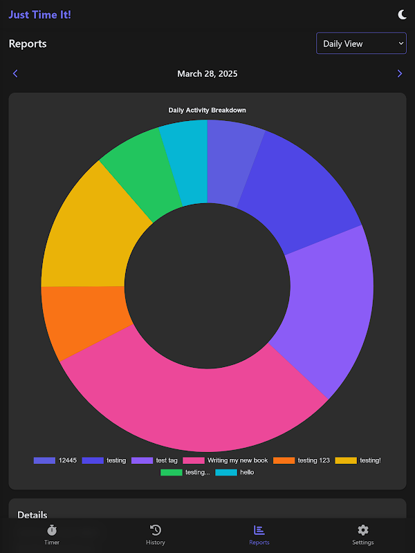 Báo cáo đẹp mắt: Nhận báo cáo hàng ngày, hàng tuần và hàng tháng rõ ràng, toàn diện, thể hiện trực quan việc sử dụng thời gian của bạn. Xem chính xác thời gian của bạn đang đi đâu và xác định các lĩnh vực cần cải thiện.