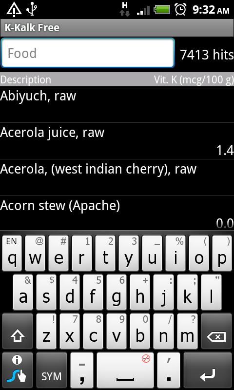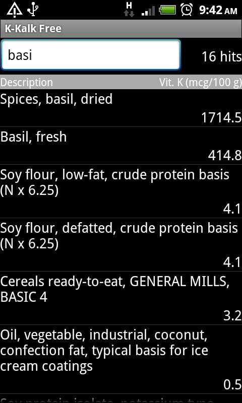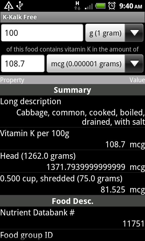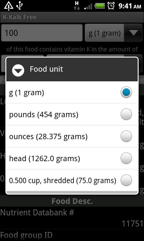 This application calculates the vitamin K content of foods based on release 21 of the USDA National Nutrient Database for Standard Reference. It is particularly useful for individuals on anticoagulant therapy who are taking Warfarin or its brand name counterparts (Coumadin®, Jantoven®, Marevan®, and Waran®), which interact with vitamin K. Take this application on your phone to the grocery store and restaurants to plan menus and look up unfamiliar foods so that you can maintain a stable vitamin K intake. Note: Always consult your doctor and/or nutritionist for advice on medicine and diet.