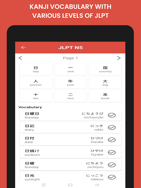 Kanjikita cho phép bạn đánh dấu chữ kanji hoặc những từ bạn đã học, giúp bạn theo dõi tiến độ học tập của mình. Ứng dụng này được thiết kế để dễ sử dụng, mang lại trải nghiệm học tập hiệu quả và trực quan.