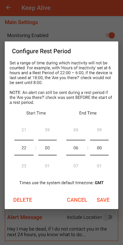 - Phạm vi thời gian nghỉ ngơi - một khoảng thời gian trong đó việc không hoạt động sẽ không được tính. Ví dụ: với 'Giờ không hoạt động' được đặt là 6 giờ và Thời gian nghỉ là 22:00 - 6:00, nếu thiết bị được sử dụng lần cuối vào lúc 18:00, thông báo 'Bạn có ở đó không?' séc sẽ không được gửi cho đến 8 giờ. Lưu ý rằng cảnh báo vẫn có thể được gửi trong thời gian nghỉ nếu thông báo 'Bạn có ở đó không?' séc đã được gửi TRƯỚC KHI bắt đầu thời gian nghỉ ngơi.