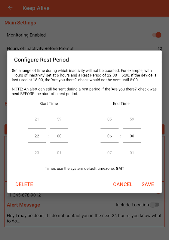 - Phút chờ - nếu lời nhắc không được xác nhận trong thời gian này, Cảnh báo sẽ được gửi dựa trên cài đặt liên hệ khẩn cấp đã định cấu hình. Mặc định là 60 phút