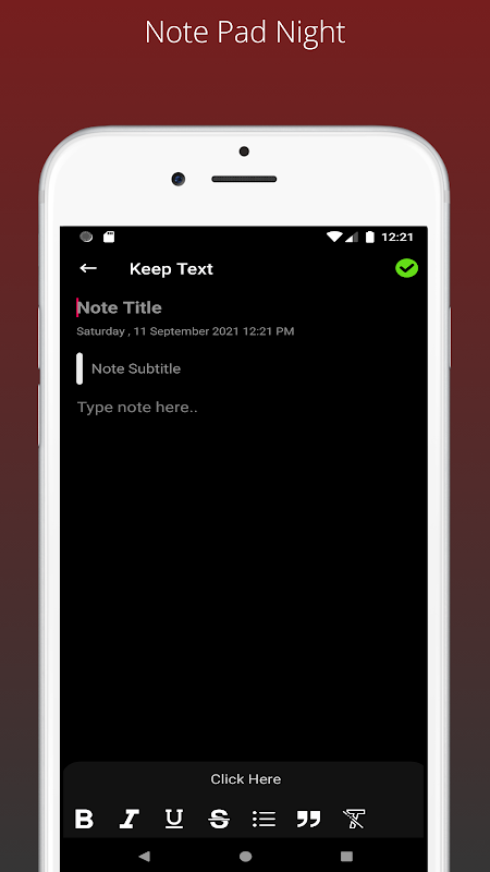 Keep text serving as a simple word processing program, the text option allows for as many characters as you're willing to type. Once saved, you can edit, share, set a reminder, or check off or delete the note through your device's menu button. When checking off a text note, the app places a slash through the list's title, and this will be displayed on the main menu.