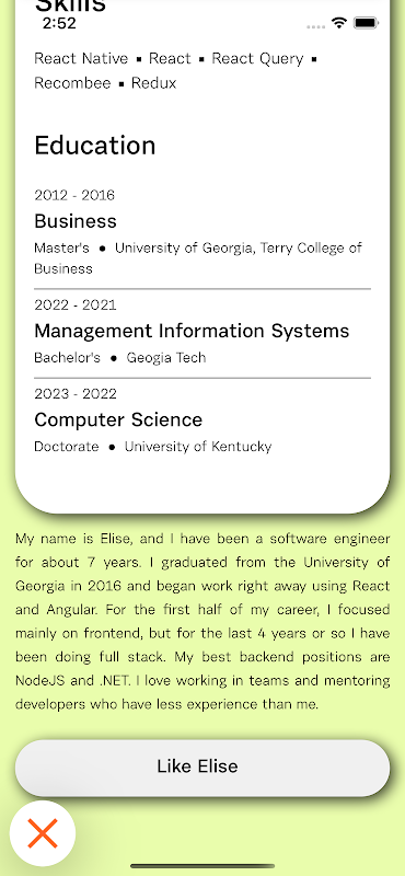 Các nhà tuyển dụng hoặc bất kỳ ai muốn thuê kỹ sư phần mềm đều có thể tạo việc làm, mỗi người sẽ có nguồn cấp dữ liệu nhà phát triển phần mềm phù hợp riêng cho công việc đó. Cái nào có thể được vuốt sang phải hoặc trái, có khả năng dẫn đến trùng khớp.