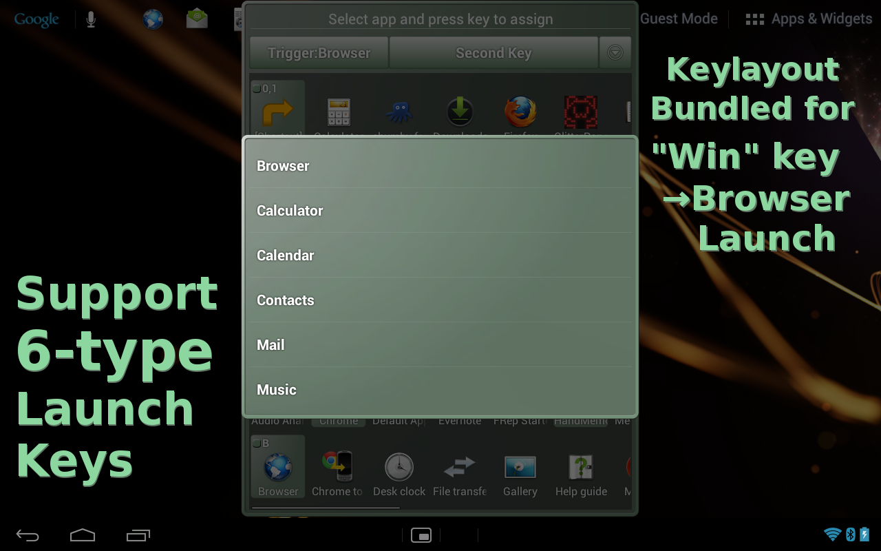 - Khởi chạy ứng dụng / kích hoạt shortcut / hiển thị phụ launcher bởi mỗi "ứng dụng khởi động" chìa khóa