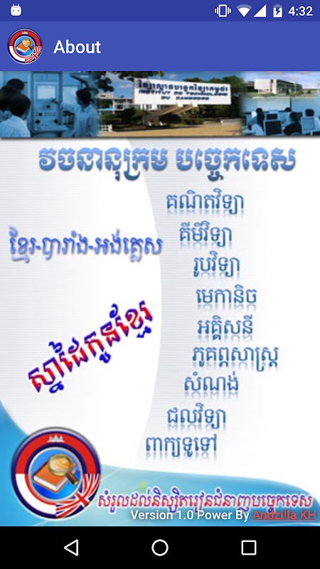 Khmer Technical Dictionary (English - Khmer, French - Khmer) is an application that allows student at university do research the technical courses that relevant to science such as Mathematic, Physic, Chemistry, Electronic, Mechanic and other engineering courses. I hope that it will offer a easy way for their studies and deep understanding more.
