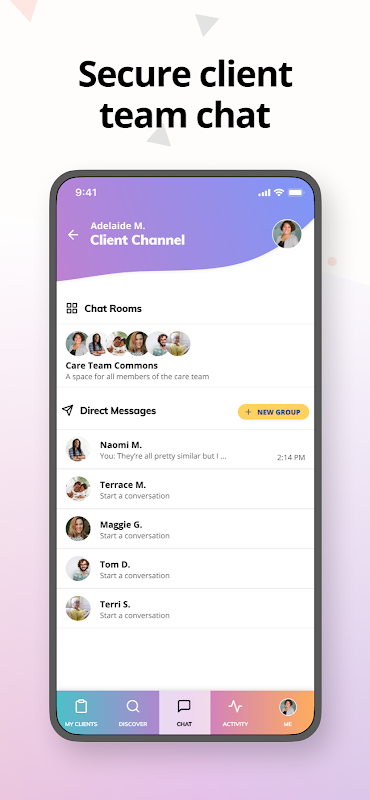 - Chat securely with client caregivers, improving care team collaboration and communication.