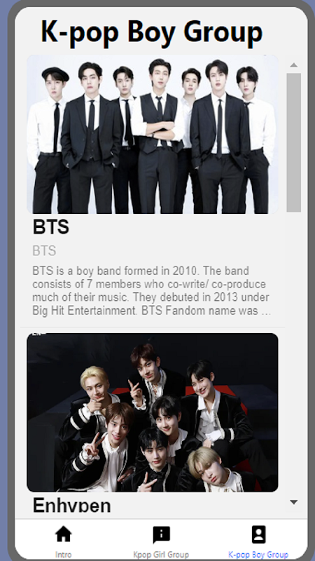 Ứng dụng này nói về nhóm nhạc nam và nữ K-pop. Như vậy khi bấm vào ứng dụng bạn sẽ thấy phần giải thích hoặc thông tin ngắn gọn về nhóm, bên cạnh thông tin còn có ảnh của các thành viên trong nhóm. Một số ví dụ về các nhóm trong ứng dụng là BlackPink và BTS. Hy vọng bạn thích ứng dụng này! Giữ an toàn và có một ngày tốt đẹp :)