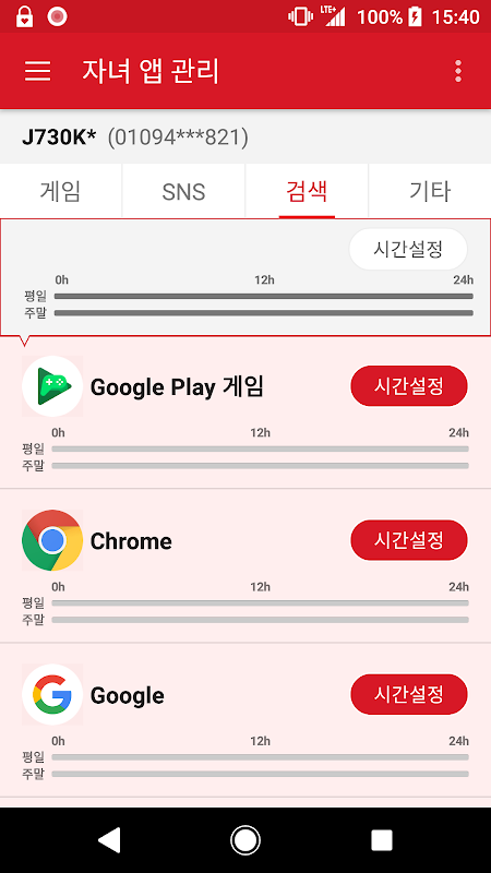 2. 자녀폰에서 게임, 메신저 등의 앱의 사용시간 조절 및 개별차단 가능!