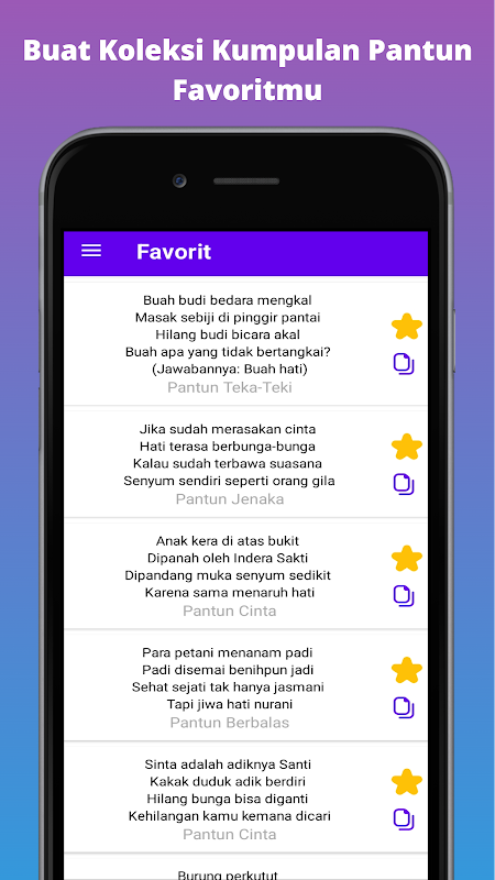 Ứng dụng "Bộ sưu tập hoàn chỉnh mới của Pantun" cung cấp các vần điệu thuộc nhiều danh mục khác nhau, hãy tìm tất cả các loại vần điệu bạn muốn tại đây.