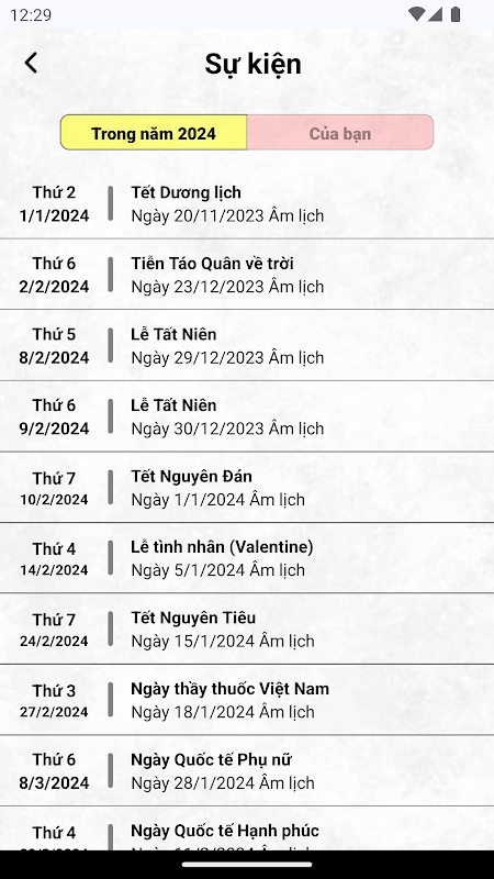- Các sự kiện ngày lễ tết được cập nhật liên tục, nhanh chóng khi có quyết định nghĩ lễ, tết. Giúp bạn chủ động lên kế hoạch cho kỳ nghĩ của mình